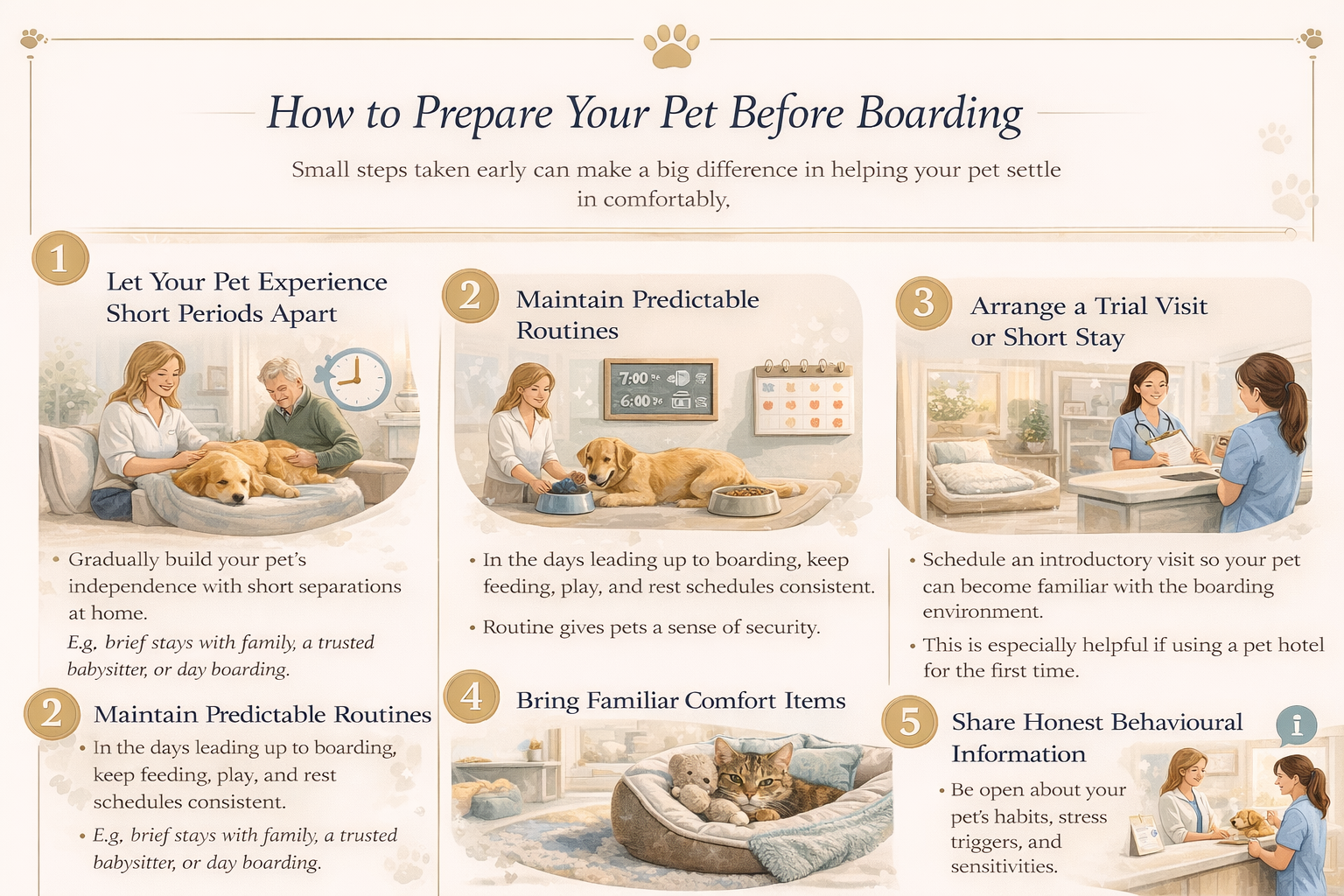 Routine gives pets a sense of control. When something as significant as boarding is approaching, consistency in the home environment helps reduce the emotional impact of change.